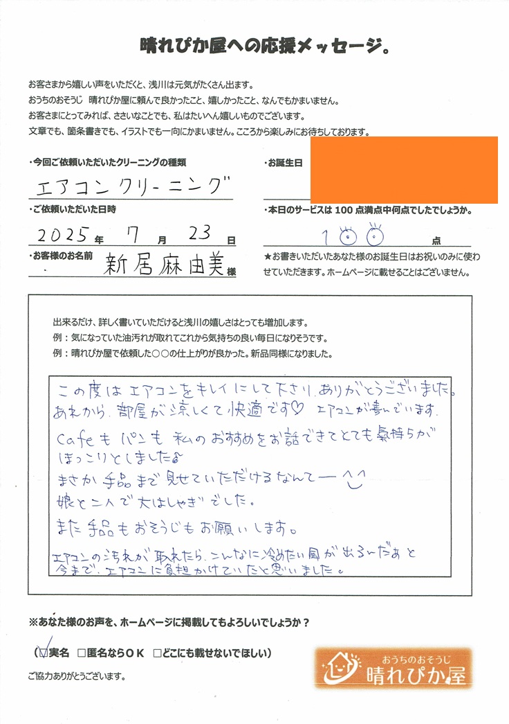 お客様の声 新居さま エアコンクリーニング